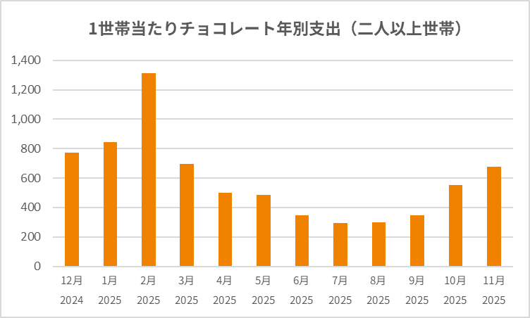 日本のチョコレート消費は、バレンタインデーに年間最大のピークを迎えます。総務省の家計調査(※1)によると、2月のチョコレート支出金額は他の月の平均と比較して約2.6倍に急増しますが、イベント終了後の3月以降は需要が急激に落ち込みます。そのため、バレンタイン商戦に向けた大量生産の過程で発生した「規格外品」や、ギフト需要から外れた商品は、販売のチャンスを失い、長期在庫や廃棄のリスクが高まるという構造的な課題を抱えています。